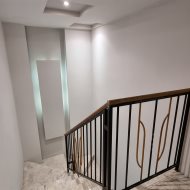 - KLATKA SCHODOWA : SCHODY WEWNĘTRZNE - żelbetowe + okładzina drewniana, barierki drewno i stal, ŚCIANY GŁADZIE GIPSOWE i BOAZERIA w kolorze białym