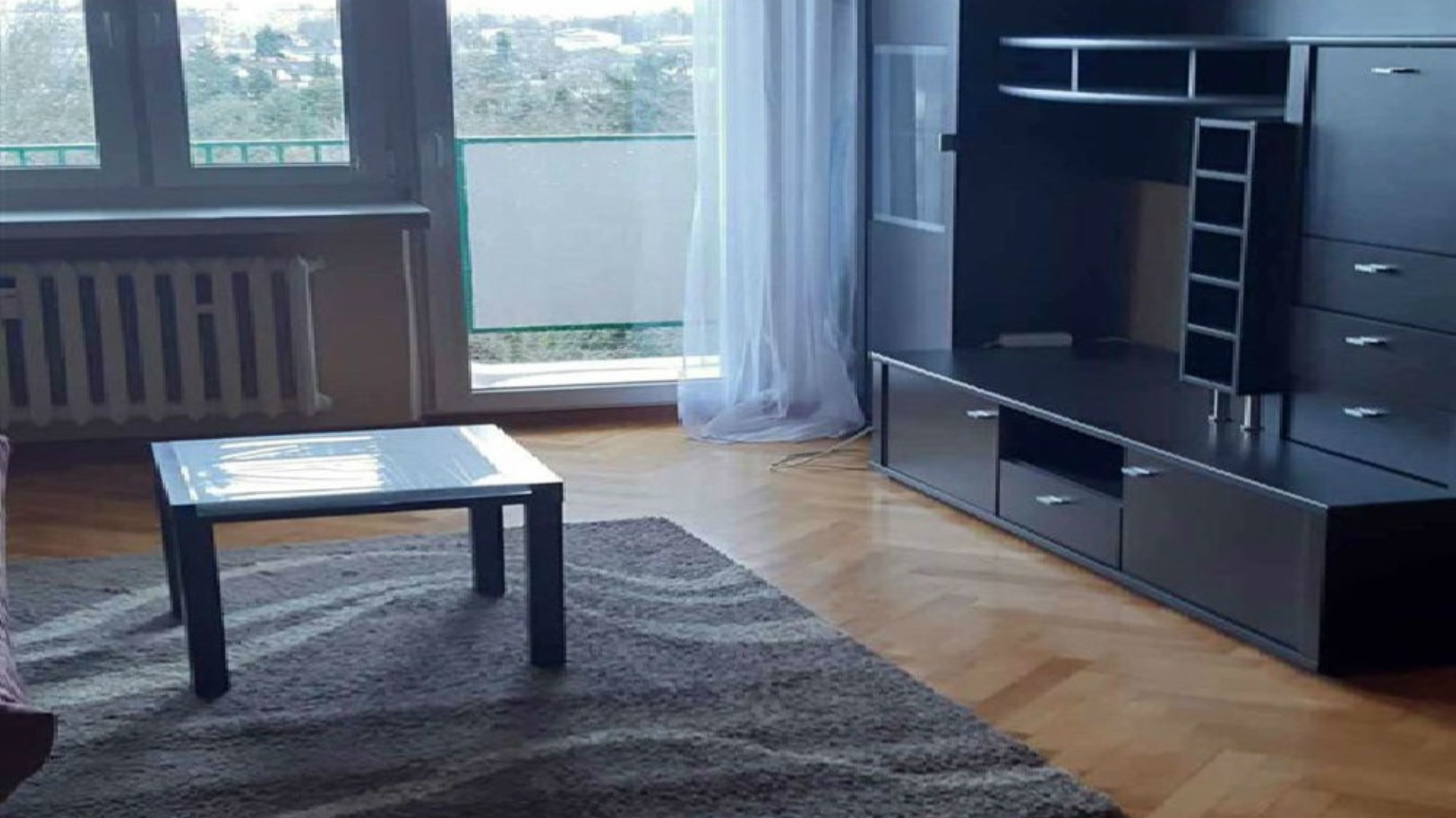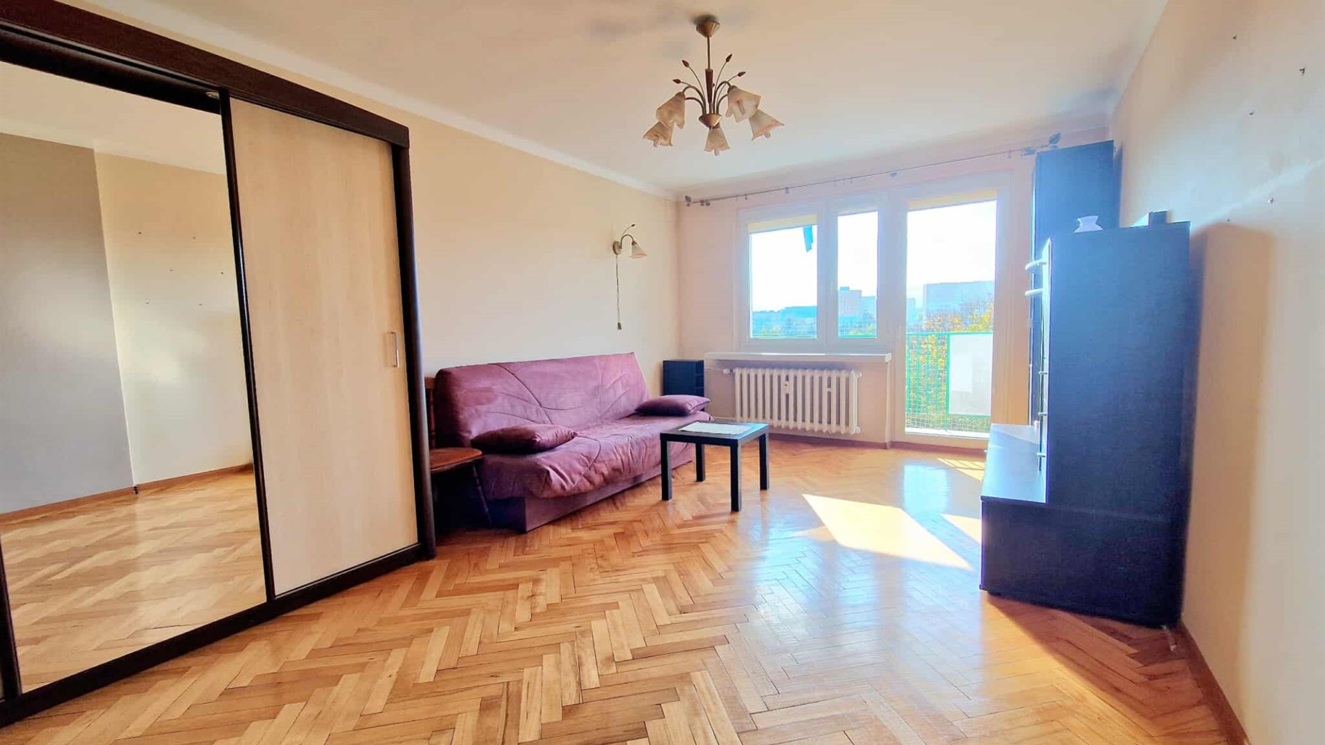 - I pokój ( 20m2) na podłodze parkiet, ściany gładź, szafa, kanapa, stolik , meblościanka