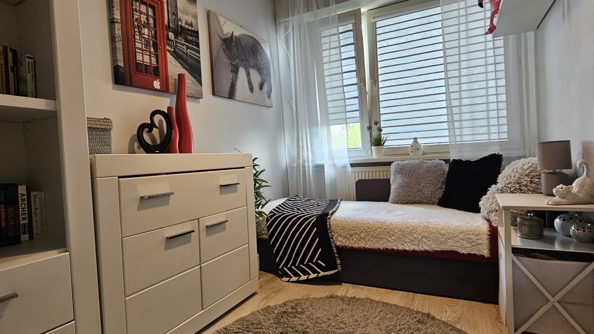 Mieszkanie jest dwustronne, dzięki czemu wnętrza są doskonale doświetlone przez cały dzień. Okna skierowane są na wschód i zachód. W mieszkaniu większość mebli zostaje. Mieszkanie składa się z dużego salonu o pow. 25m2, pokoju z oknami za wschód i szafą wnękową o pow. 6,5m2, pokoju z balkonem o pow. 14,50m2, wc, osobnej łazienki z prysznicem, kuchni widnej z oknem oraz przedpokoju z szafą wnękową. W całym mieszkaniu gładzie, częściowo tapeta, która komponuje się z wystrojem wnętrza.