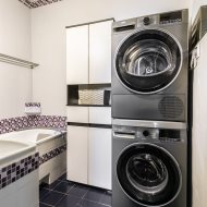 W mieszkaniu ściany - gładź malowana, kamień ozdobny, podłogi panele.