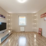 Mieszkanie zostało odmalowane w kolorach beżu, na podłogach leżą panele.