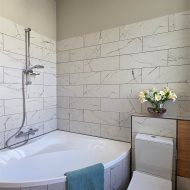 Wspólna przestrzeń jest połączona i komfortowa, kuchnia (ok.10 m2) stanowi centrum komunikacyjne z salonem, łazienką i balkonem. W każdym pomieszczeniu jest duże okno, również w łazience. W salonie (18 m2) jest okno na podwórko w kierunku zachodnim. Łazienka jest przestronna z narożną wanną.