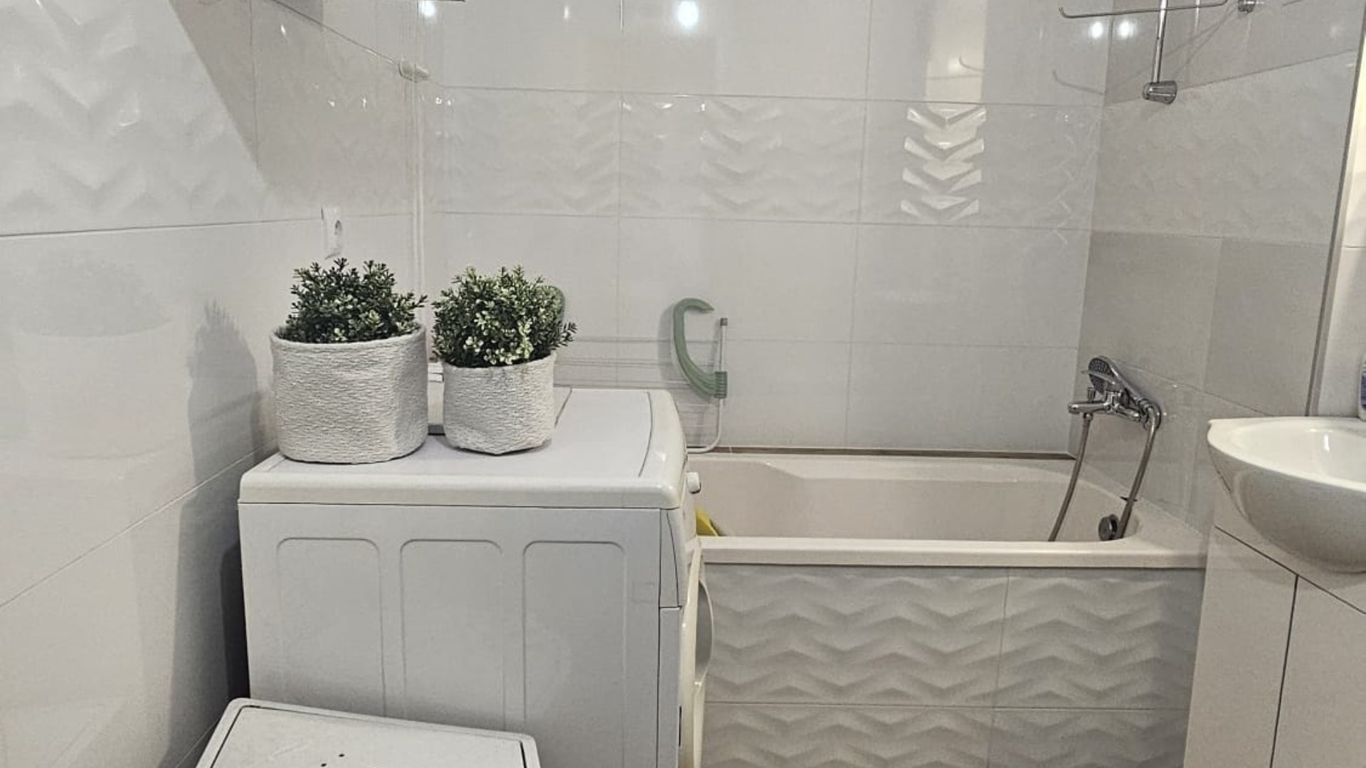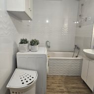 W łazience znajduje się umywalka, wc stojące, wanna.