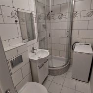 Łazienka- glazura terakota, kabina, kompakt, pralka, szafka na kosmetyki, środki czystości.