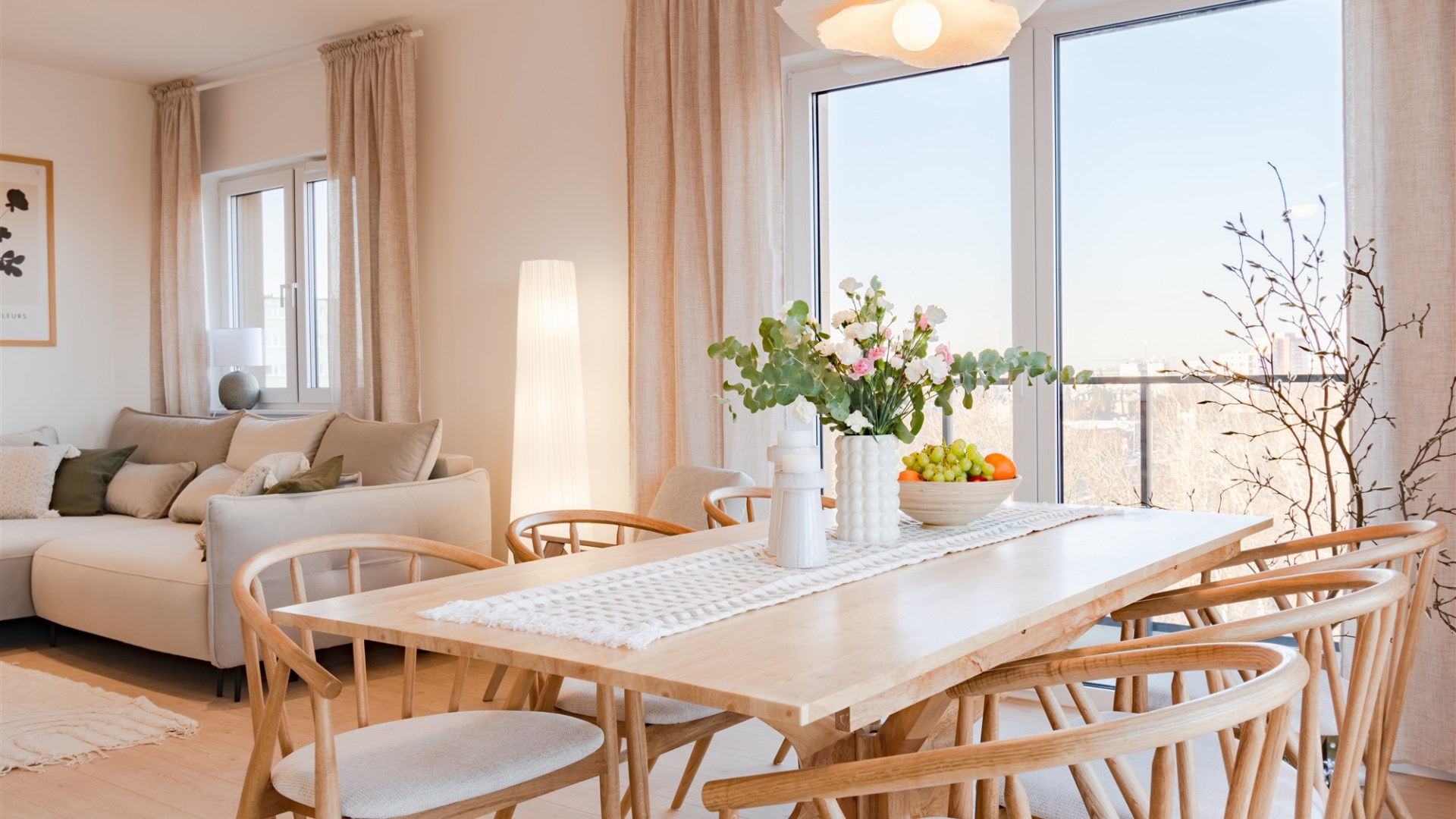 oraz strefę jadalnianą z dużym stołem, wszystko dopełnia duży balkon;