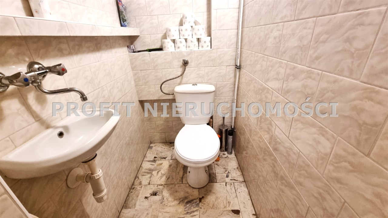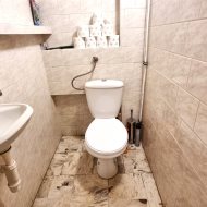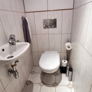 w WC : sedes, umywalka, podłoga podłoga marmur łupany, ściany glazura,