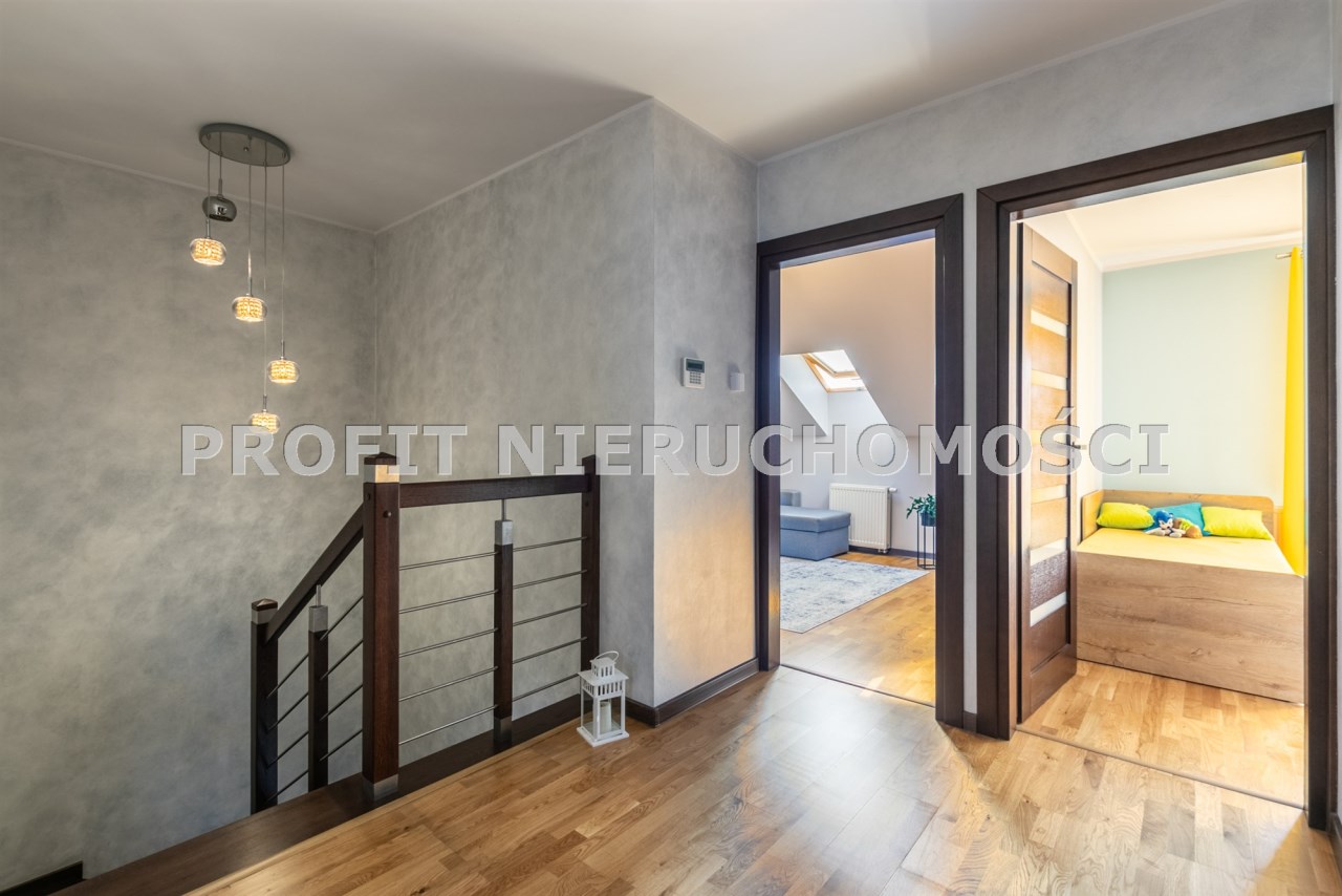 Piętro domu stanowią cztery niezależne sypialnie i łazienka. Z czego dwa pokoje mają również balkony.
