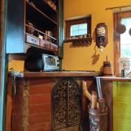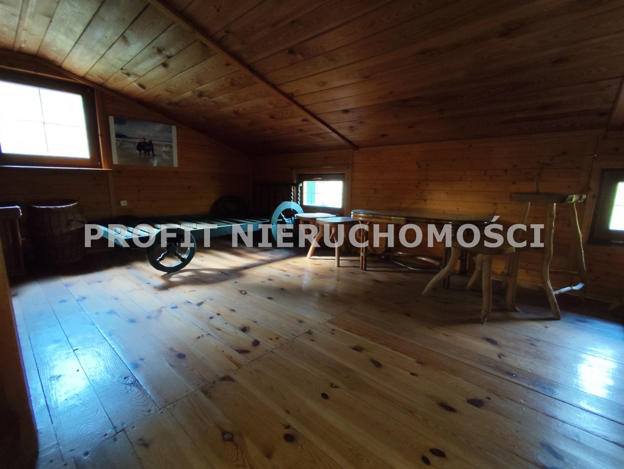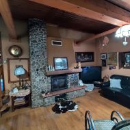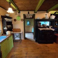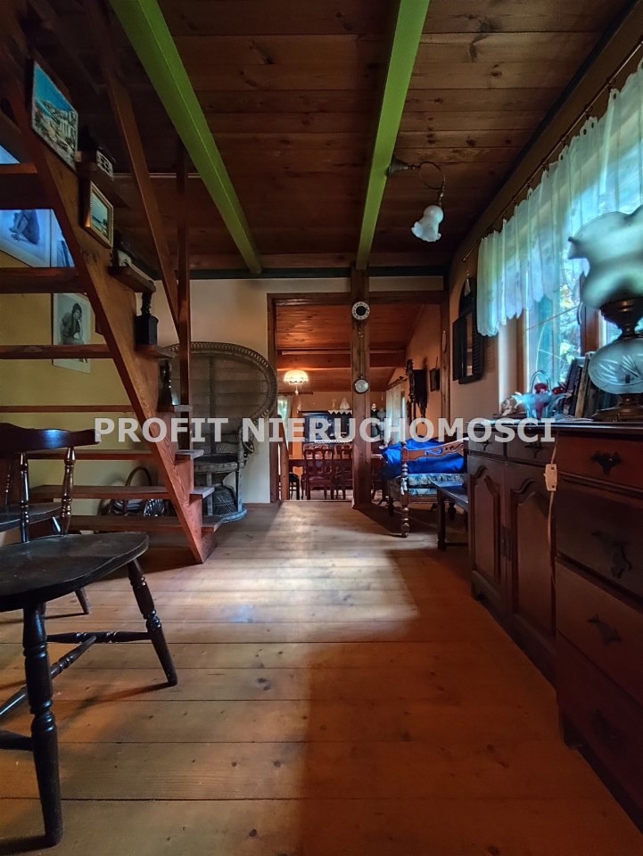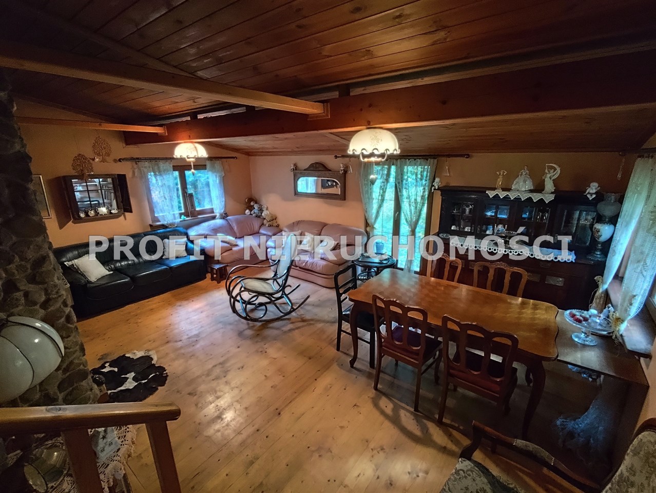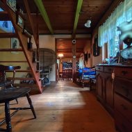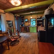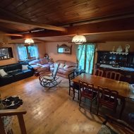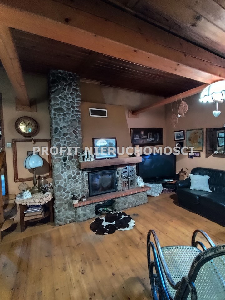 Dom posiada przestronny, klimatyczny salon z kominkiem, którego kamienna obudowa nadaje wnętrzu przytulny, góralsko-letniskowy charakter. Drewniane sufity i podłogi tworzą wyjątkowy nastrój, a liczne okna zapewniają naturalne oświetlenie oraz widok na otaczającą zieleń.