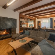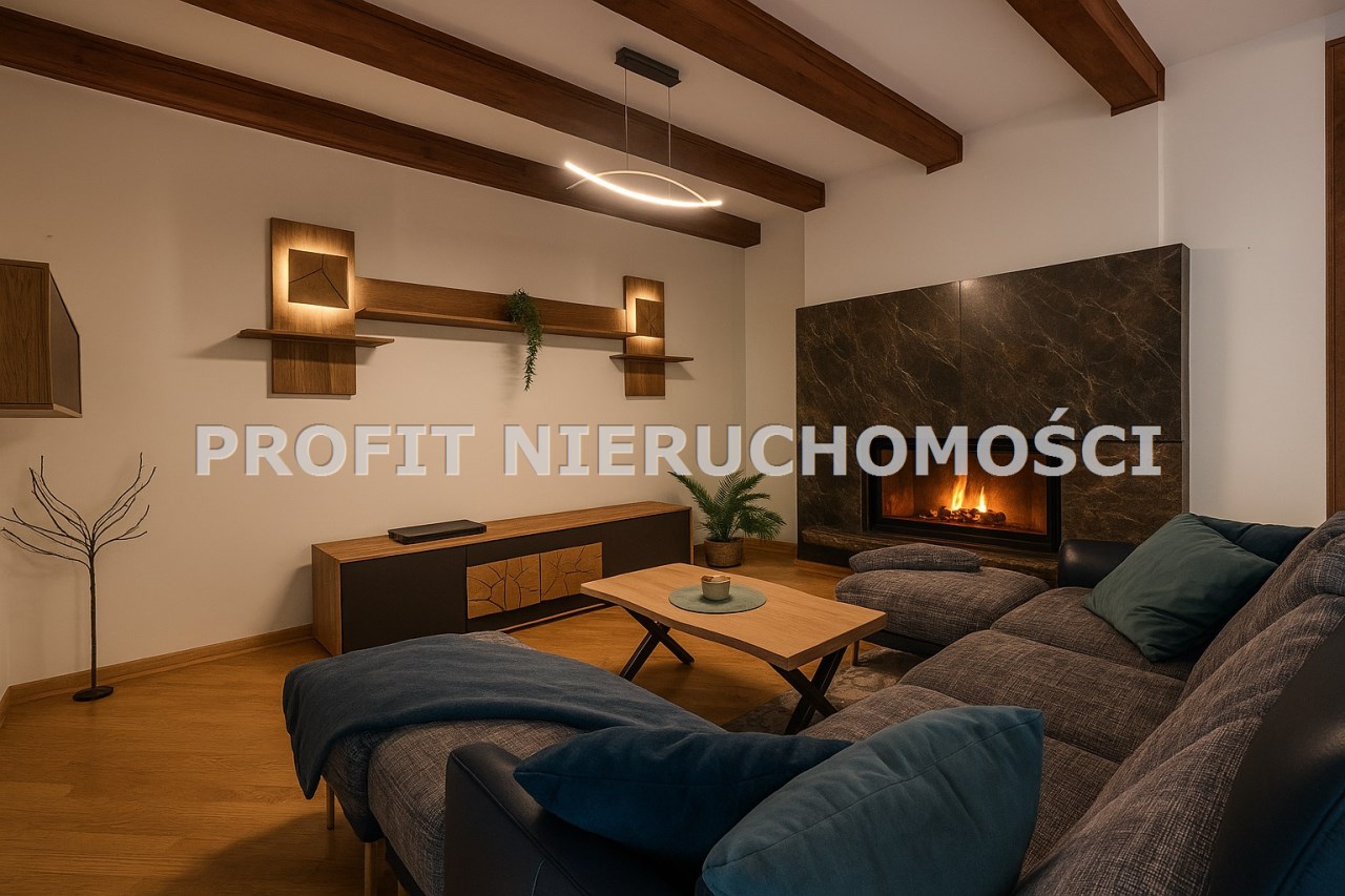 W salonie znajduje się zamknięty kominek z rozprowadzeniem ciepła na poddasze.
