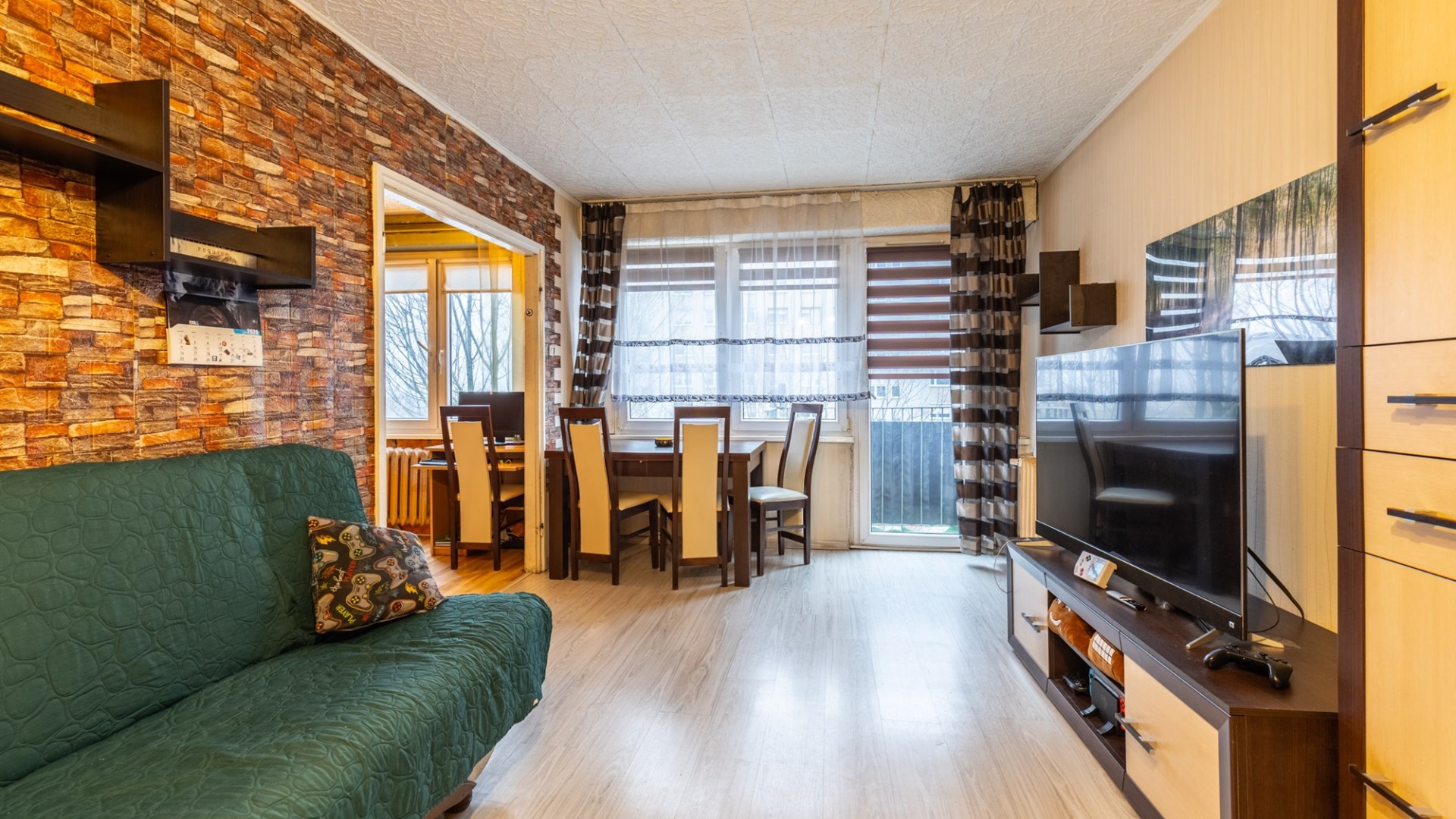 Okolica jest wyjątkowo cicha i zielona, a widok z mieszkania rozciąga się na osiedle.