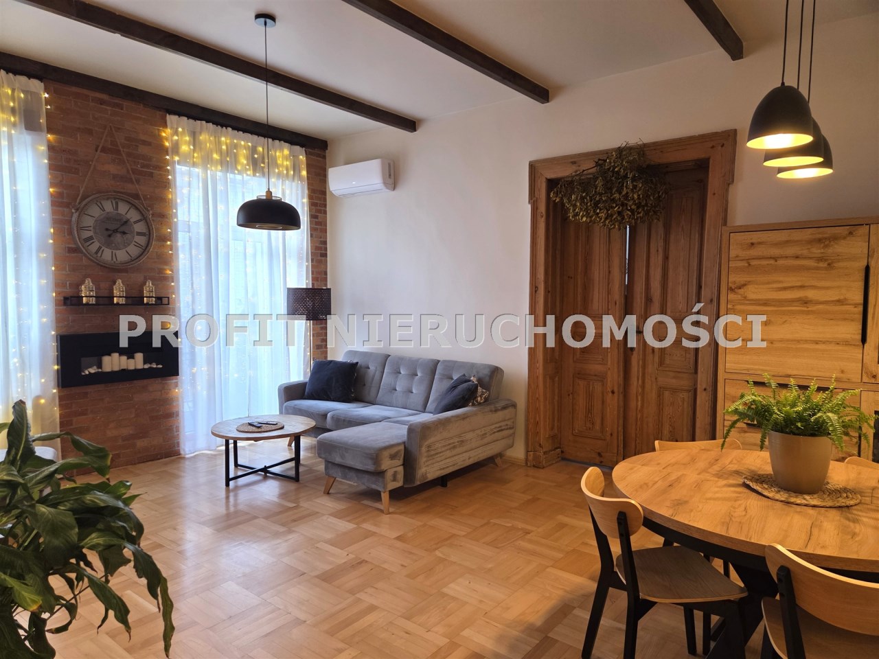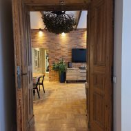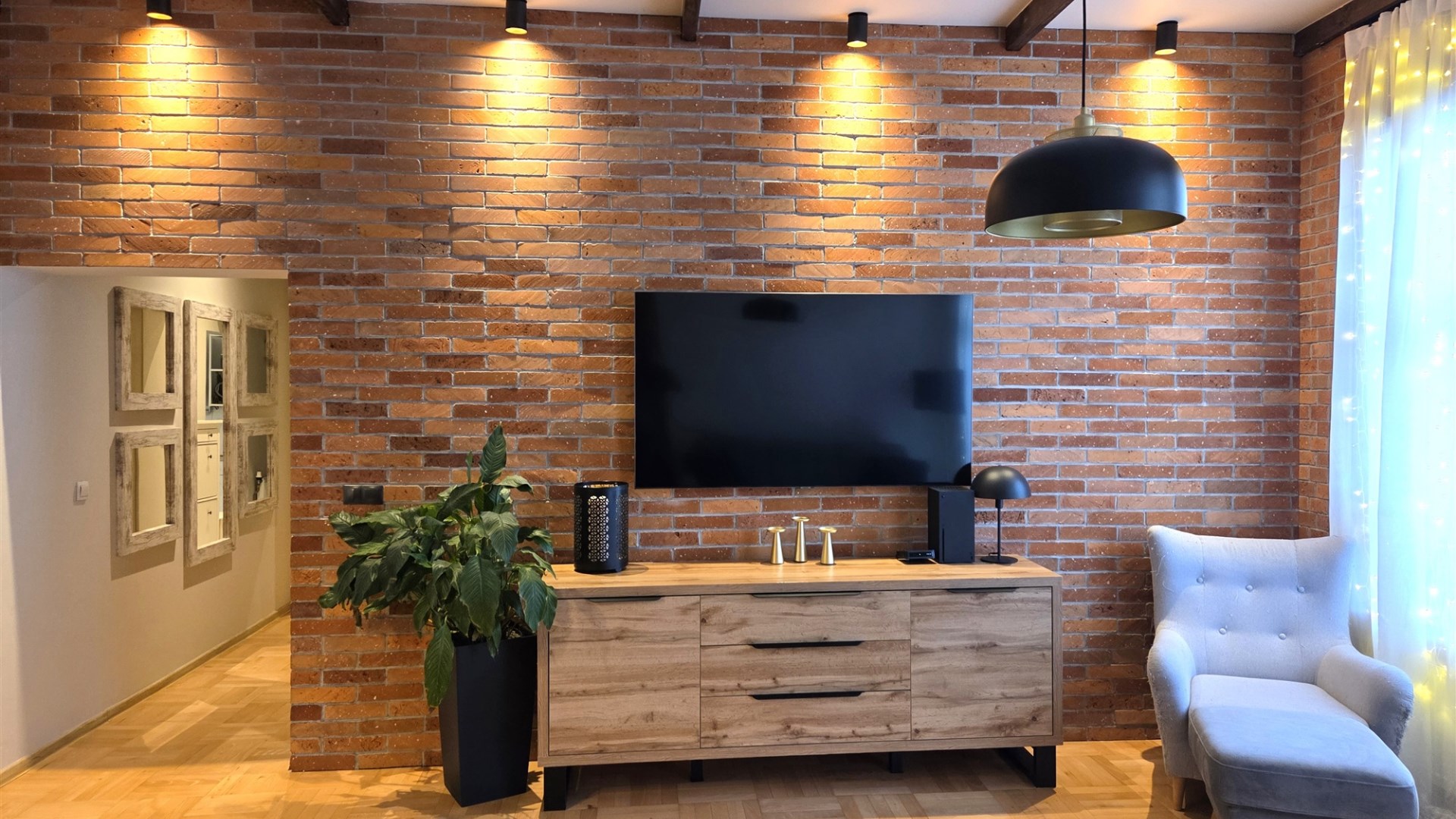 Loftowy charakter apartamentu podkreśla ściana wykonana z prawdziwej cegły oraz piękne drewniane drzwi łączące salon z częścią sypialnianą. Ponadto uwagę zwracają przemyślane rozwiązania oświetleniowe.