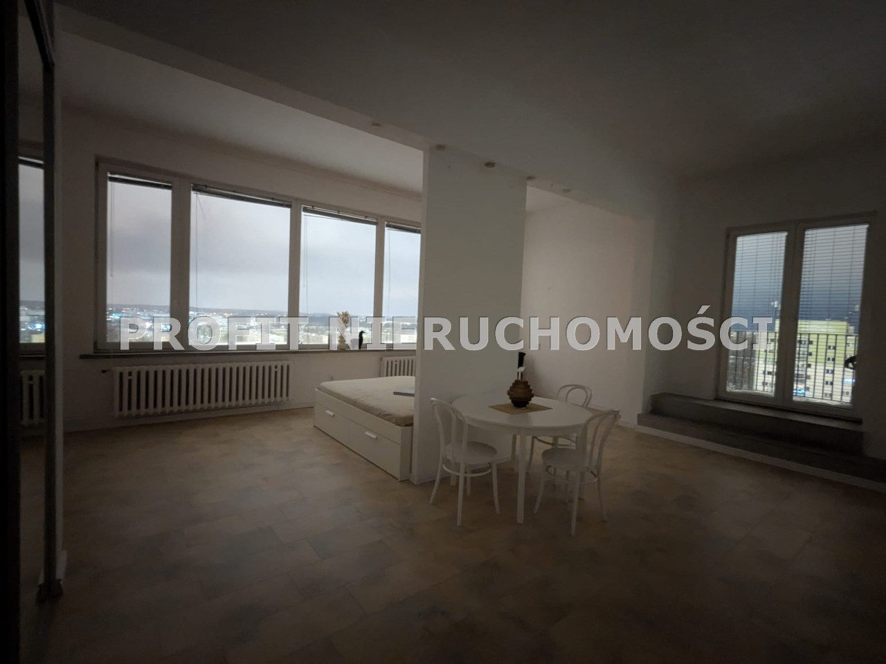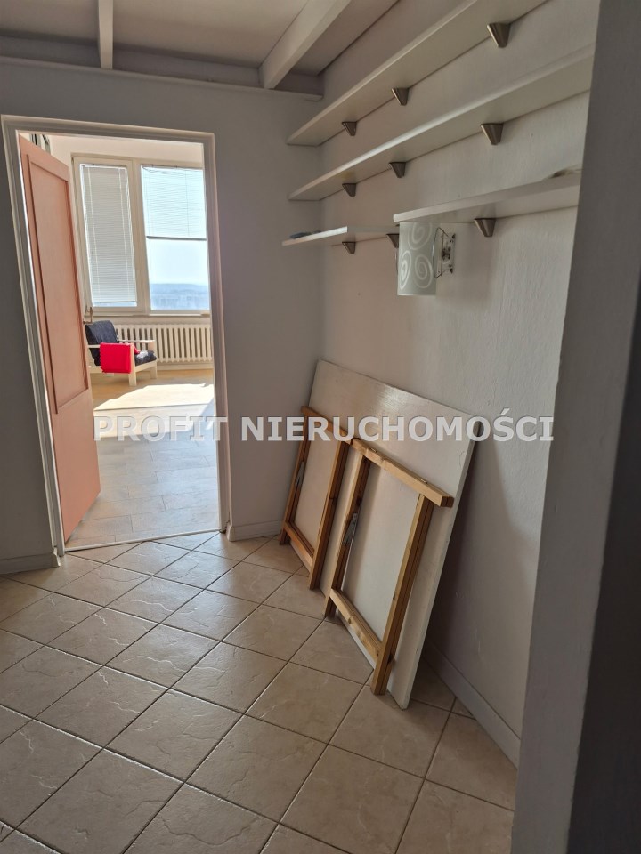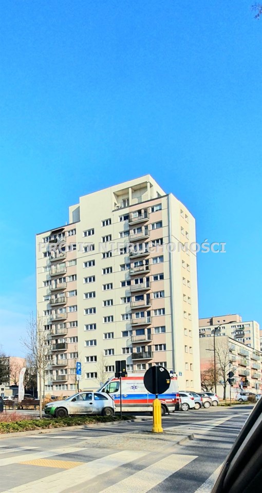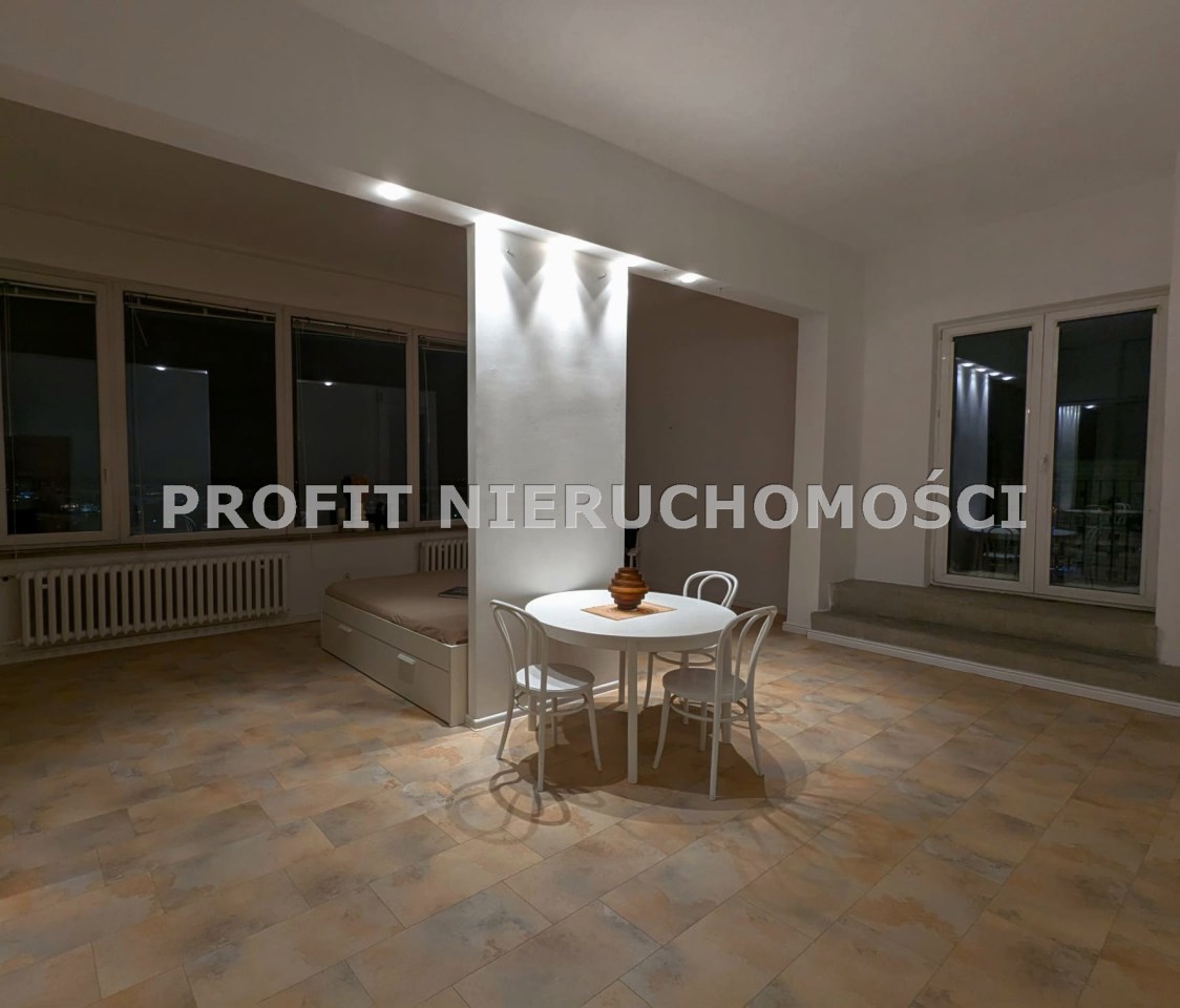 Przestronne, wysokie mieszkanie o powierzchni ok. 62 mkw, o nietypowym rozkładzie położone na 11 piętrze w wieżowcu z windą nowego typu. Mieszkanie składa się z dużego pokoju (ponad 40mkw, wysokość ok 3,5 m), kuchni, łazienki z wc i przedpokoju, z którego jest wejście schodami na antresolę, na której można urządzić miejsce do spania lub dodatkowe miejsce do przechowywania. Mieszkanie posiada zadaszony taras z ciekawym widokiem. Dwie nowe windy. Suszarnia na piętrze. Wystawa okien - południe, wschód, zachód.