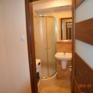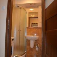 - łazienka połączona z wc - w glazurze i terakocie, kabina natryskowa, podwieszane wc, umywalka z szafką, pralka