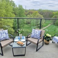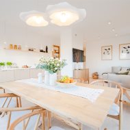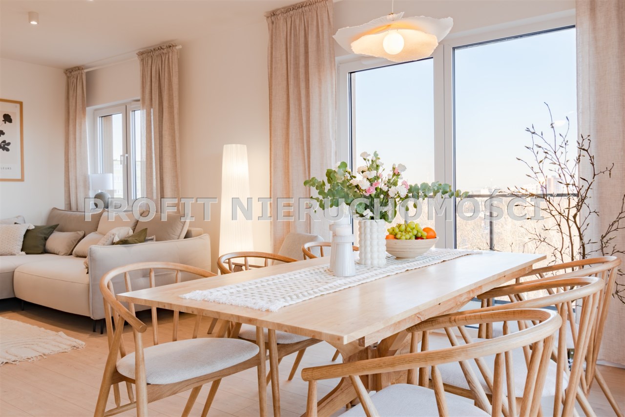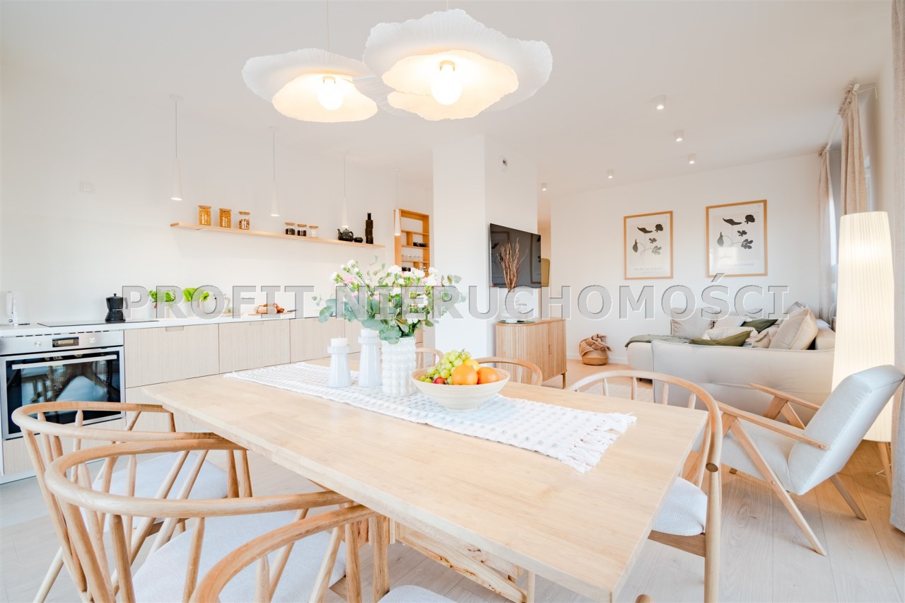 oraz strefę jadalnianą z dużym stołem, wszystko dopełnia duży balkon;