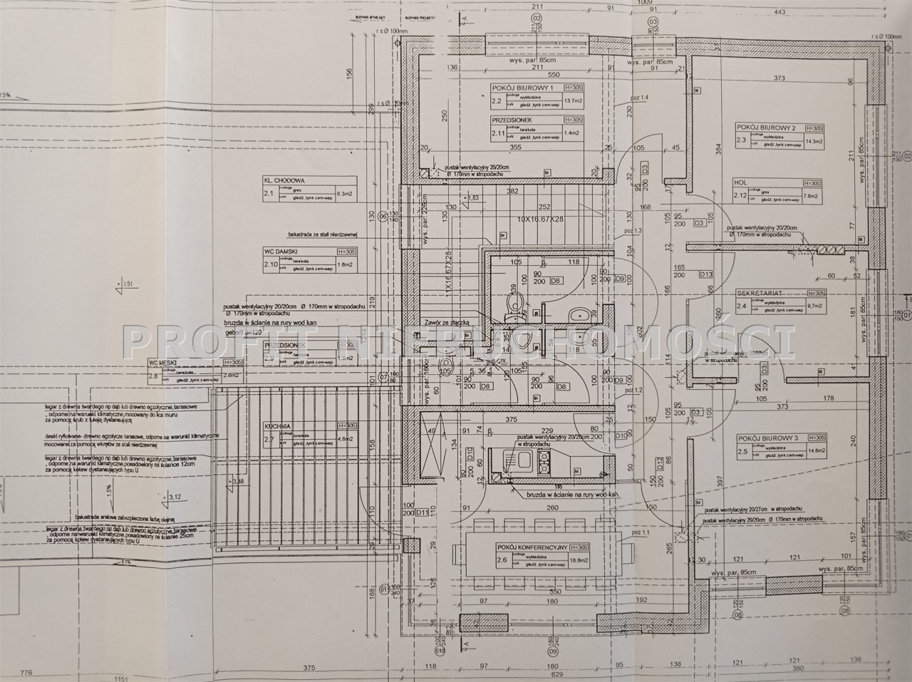 Na pierwszym piętrze otwarty aneks kuchenny, 3 biura, sala konferencyjna na ok. 30 osób z kuchnią, łazienka damska i męska,